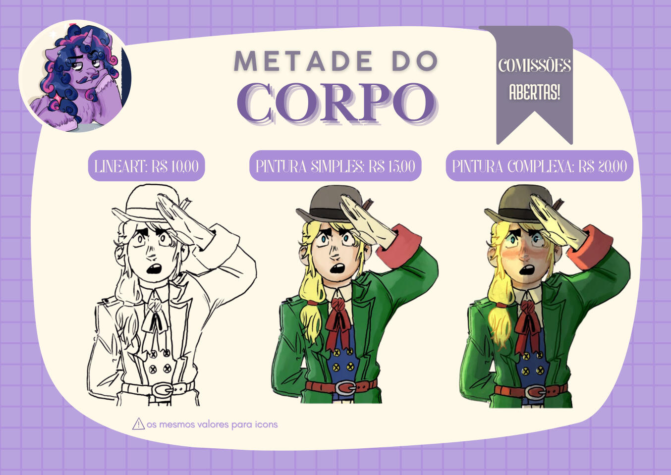lineart: R$ 10,00 pintura simples: R$ 15,00 pintura complexa: R$20.00mesmos valores para icons