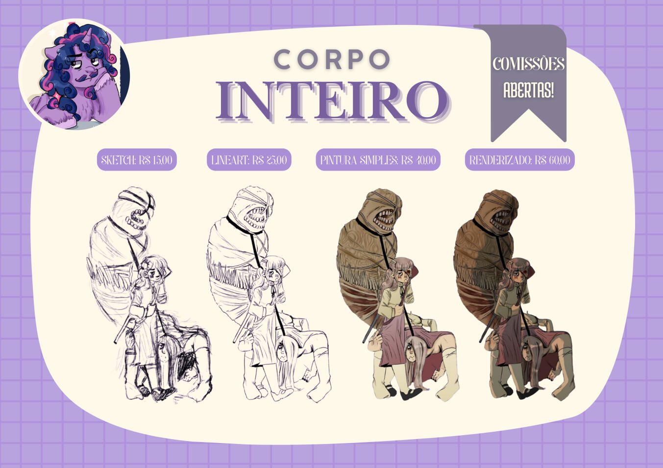 sketch: R$ 15,00 lineart: R$ 25,00 pintura simples: R$ 40,00 renderizado: R$ 60,00